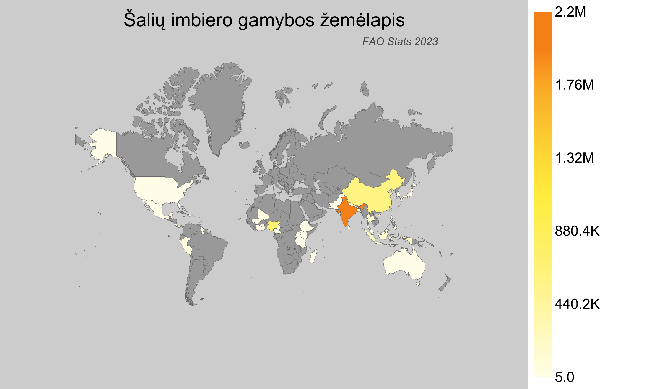 - Lietuva į FAO statistikos duomenis nepatenka kaip imbiero gamintoja, todėl jos gamybos statistika nėra registruota.